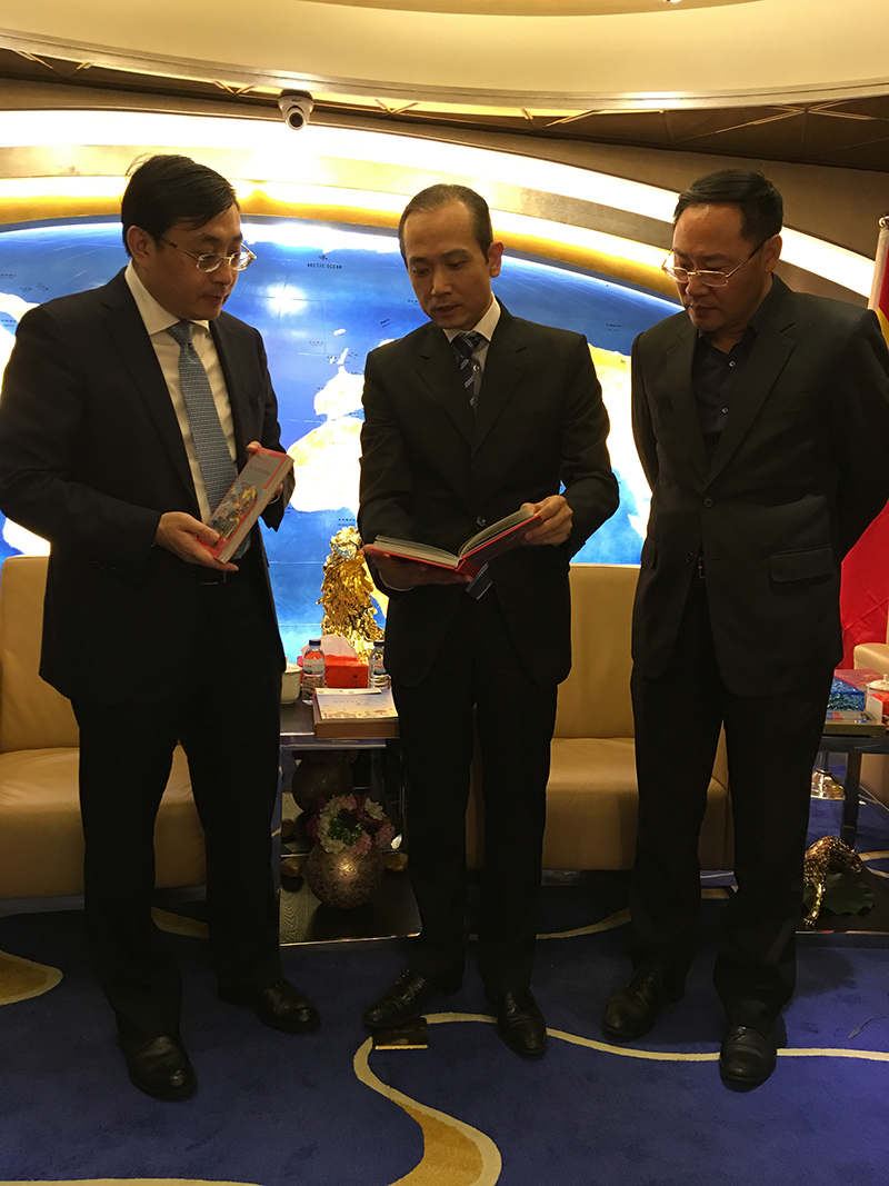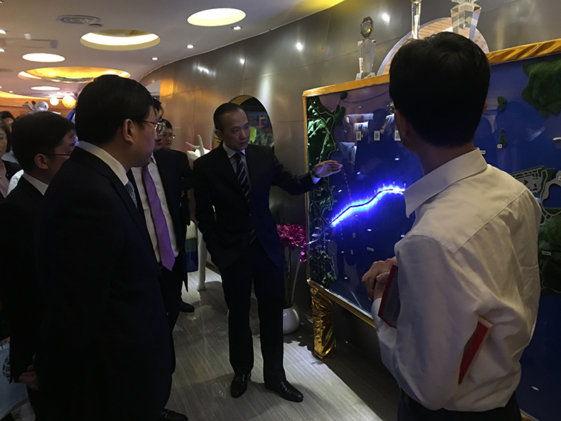 萬(wàn)國(guó)集團(tuán)董事會(huì)主席劉雅煌(右二)向常州市委副書記、市長(zhǎng)費(fèi)高雲(yún)一行介紹港珠澳大橋