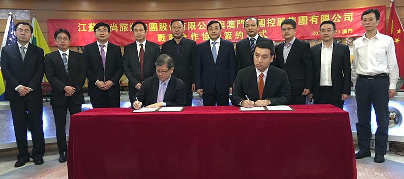 景尚旅業(yè)集團(tuán)股份有限公司董事長(zhǎng)孫曉東(前右)與萬(wàn)國(guó)集團(tuán)董事許國(guó)權(quán)(前左)簽署戰(zhàn)略協(xié)議