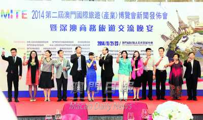 本屆旅博會組委會昨晚在深圳舉行新聞發(fā)佈會暨深澳商務(wù)旅遊交流晚宴,介紹相關(guān)籌備情況。澳門旅行社協(xié)會會長劉雅煌、深圳市文體旅遊局副局長楊永群、廣東省僑聯(lián)副主席孔愛玲、深圳市僑聯(lián)主席馬勇智等,以及深澳兩地各大旅行社和業(yè)界協(xié)會代表等約一百六十人與會。