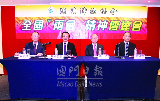 澳區(qū)全國(guó)人大代表劉藝良、陸波,澳區(qū)全國(guó)政協(xié)委員梁樹(shù)森、劉雅煌,本月三日晚在皇都酒店會(huì)議室向僑總及澳門(mén)僑界社團(tuán)負(fù)責(zé)人傳達(dá)全國(guó)“兩會(huì)”精神,闡釋修憲的重大意義和重要內(nèi)容,並向一百四十多位與會(huì)者派發(fā)《中華人民共和國(guó)憲法》,呼籲僑界細(xì)讀憲法、理解憲法、維護(hù)憲法權(quán)威。