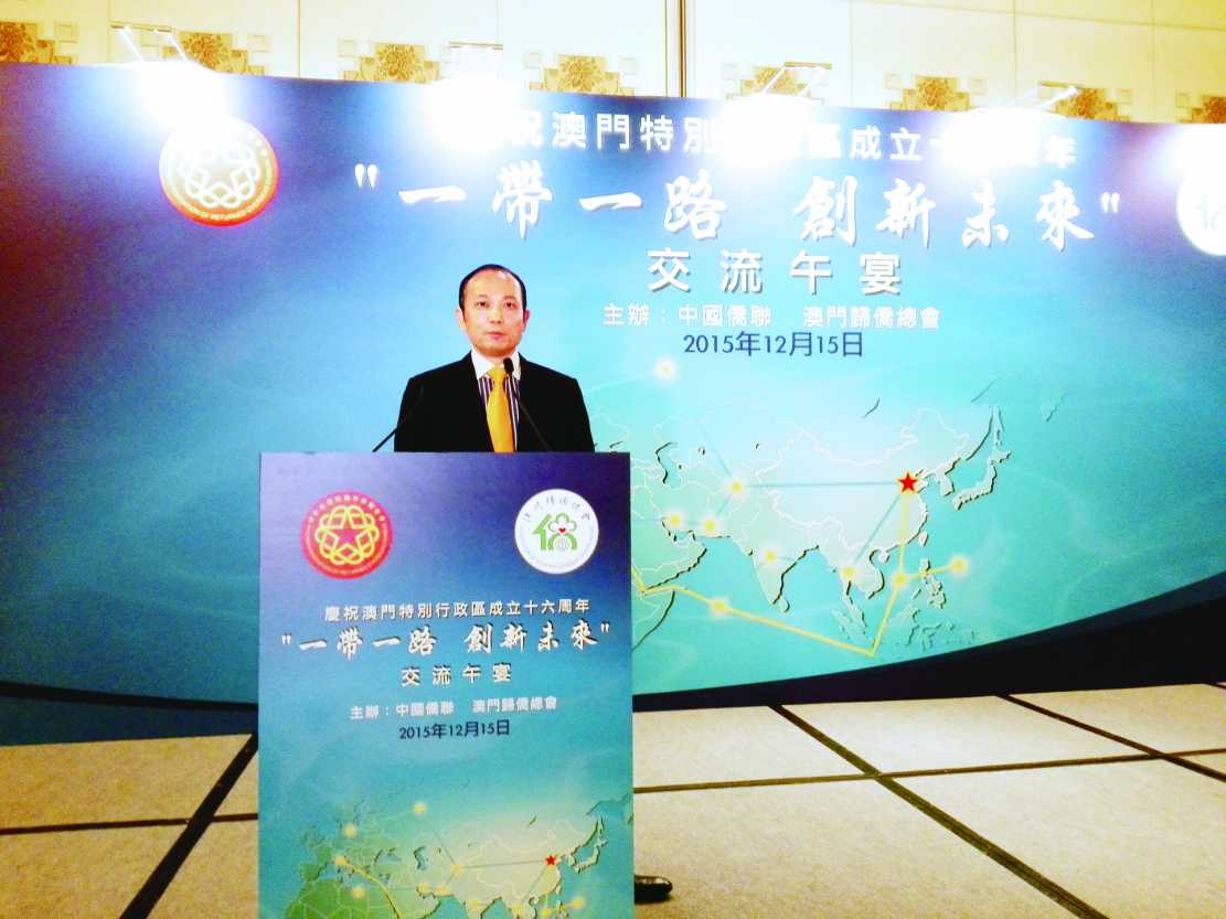 【本報(bào)訊】中國(guó)僑聯(lián)、澳門歸僑總會(huì)合辦“一帶一路 · 創(chuàng)新未來”專題講座後,即設(shè)午宴款待出席的專家和學(xué)者。全國(guó)政協(xié)委員、僑總監(jiān)事長(zhǎng)、萬國(guó)控股集團(tuán)主席劉雅煌認(rèn)為,未來全球發(fā)展離不開創(chuàng)新,面對(duì)複雜嚴(yán)峻的國(guó)內(nèi)外發(fā)展環(huán)境和宏觀經(jīng)濟(jì)下行壓力下,國(guó)家應(yīng)堅(jiān)持以創(chuàng)新力量驅(qū)動(dòng)發(fā)展戰(zhàn)略,大力推進(jìn)“大衆(zhòng)創(chuàng)業(yè),萬衆(zhòng)創(chuàng)新“。