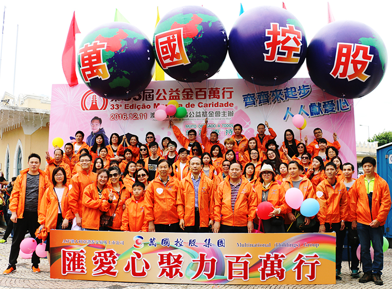 萬(wàn)國(guó)集團(tuán)董事會(huì)主席劉雅煌(前排中)帶領(lǐng)公司同仁參加由澳門日?qǐng)?bào)讀者公益基金會(huì)主辦的“第三十三屆公益金百萬(wàn)行”活動(dòng)