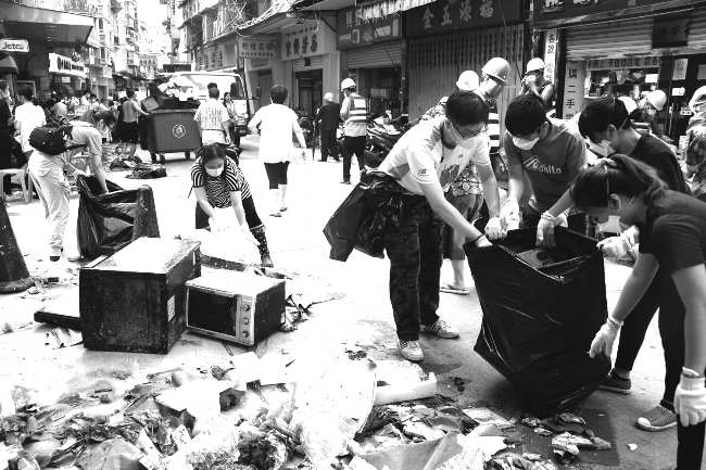 家園備受風(fēng)災(zāi)摧殘,澳門街坊鄰里迅速組織成義工隊(duì)伍,逐區(qū)協(xié)助救災(zāi)及做好善後工作。得知不少居住在高層樓宇的獨(dú)居長(zhǎng)者欠缺食水和食品,在停電的情況下,義工們爬上數(shù)十層樓宇,為弱勢(shì)群體送水送糧。不少義工堅(jiān)持下班後仍騰出時(shí)間繼續(xù)服務(wù)社區(qū)。這種無(wú)私奉獻(xiàn)的精神也鼓勵(lì)了更多人加入到服務(wù)市民、守護(hù)家園的隊(duì)伍中。