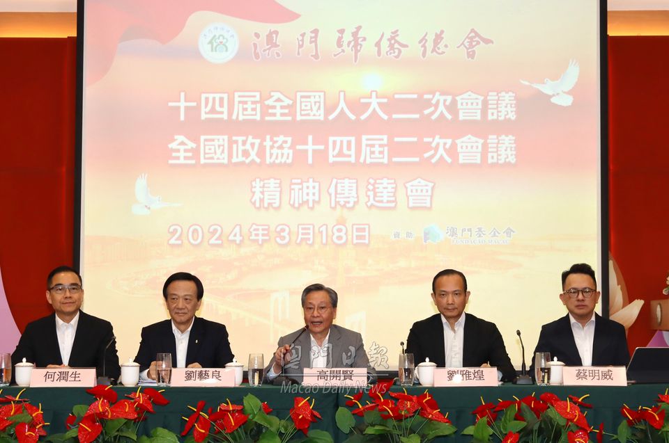 【澳門日報(bào)消息】澳門歸僑總會(huì)於周一下午三時(shí)半在會(huì)址召開“全國兩會(huì)精神傳達(dá)會(huì)”。全國人大常委高開賢,全國政協(xié)常委何潤生,澳區(qū)全國人大代表團(tuán)團(tuán)長、僑總永遠(yuǎn)會(huì)長劉藝良,全國政協(xié)常委、僑總會(huì)長劉雅煌,全國政協(xié)澳區(qū)委員、僑總副會(huì)長蔡明威分別講述在兩會(huì)期間的工作重點(diǎn)及體會(huì)。
