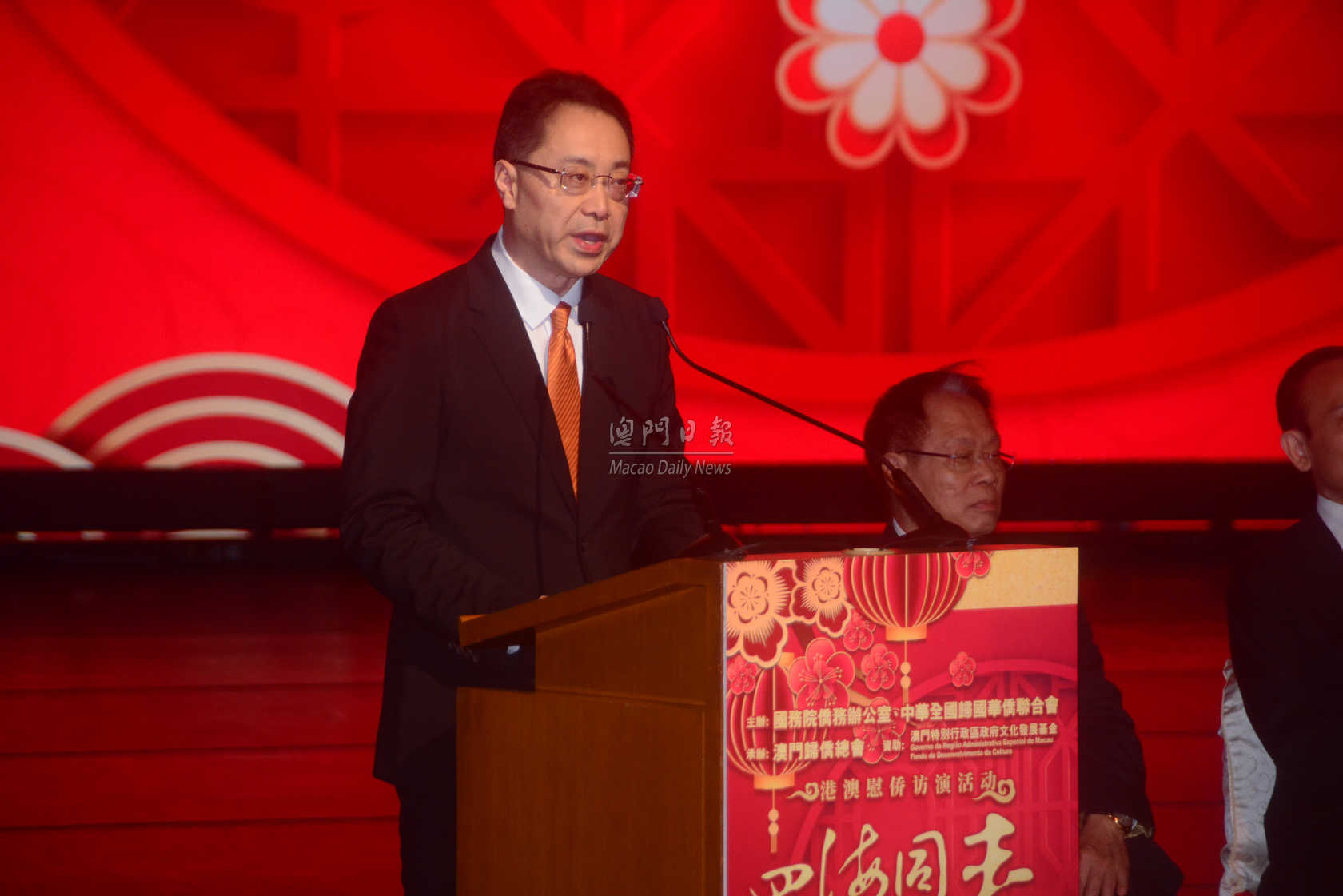 四海同春藝術團團長、中國僑聯(lián)聯(lián)誼聯(lián)絡部副部長、一級巡視員朱柳致詞稱,“四海同春”藝術團慰僑訪演已走過十五個年頭,每年春節(jié)都會組派國家級高水準藝術團,分赴全球五大洲及港澳地區(qū)開展慰僑演出,和港澳同胞、海外僑胞一起過年,也帶來祖國和家鄉(xiāng)關愛、牽掛和思念,同時讓大眾感受中華文化和鄉(xiāng)情。新一年,中國僑聯(lián)與澳門僑界將繼續(xù)增強澳門僑界的家國情懷和傳承愛國愛澳精神,堅定擁護“一國兩制”,堅決支持特區(qū)政府依法施政,積極發(fā)揮澳門僑界融通中外優(yōu)勢,對外講好中國故事、講好澳門故事,助力澳門融入國家發(fā)展大局。