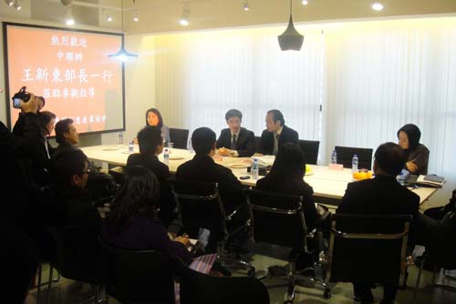 中聯(lián)辦經(jīng)濟部部長王新東、處長賀靜及助理左祥華一行到訪澳門創(chuàng)意產業(yè)協(xié)會,受到了會長劉雅煌、副會長賀培浩、監(jiān)事長曾藝、秘書長翁少鴻及協(xié)會理監(jiān)事成員的熱烈歡迎。王新東部長表示中聯(lián)辦經(jīng)濟部將繼續(xù)與特區(qū)政府和工商業(yè)界人士一同努力,促進澳門經(jīng)濟適度多元和推動澳門創(chuàng)意產業(yè)的發(fā)展,並且鼓勵協(xié)會新的一年作出更好的成績。